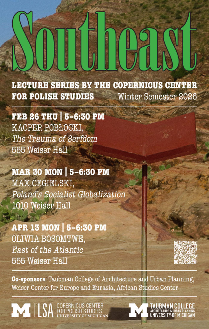 In the winter semester of 2026, in my role as Acting Director of the Copernicus Center for Polish Studies at the University of Michigan, I am convening the lecture series Southeast, which examines Poland’s encounters with Africa and Asia during the twentieth century and their lasting consequences. Speakers include the social scientist Kacper Pobłocki, who will discuss Poland’s ambiguous position in the history of European colonialism; the journalist, writer, and curator Max Cegielski, who will explore Poland’s “socialist globalization;” and the Polish-Ghanaian author Oliwia Bosomtwe, who explores the stories of Poles of African descent.